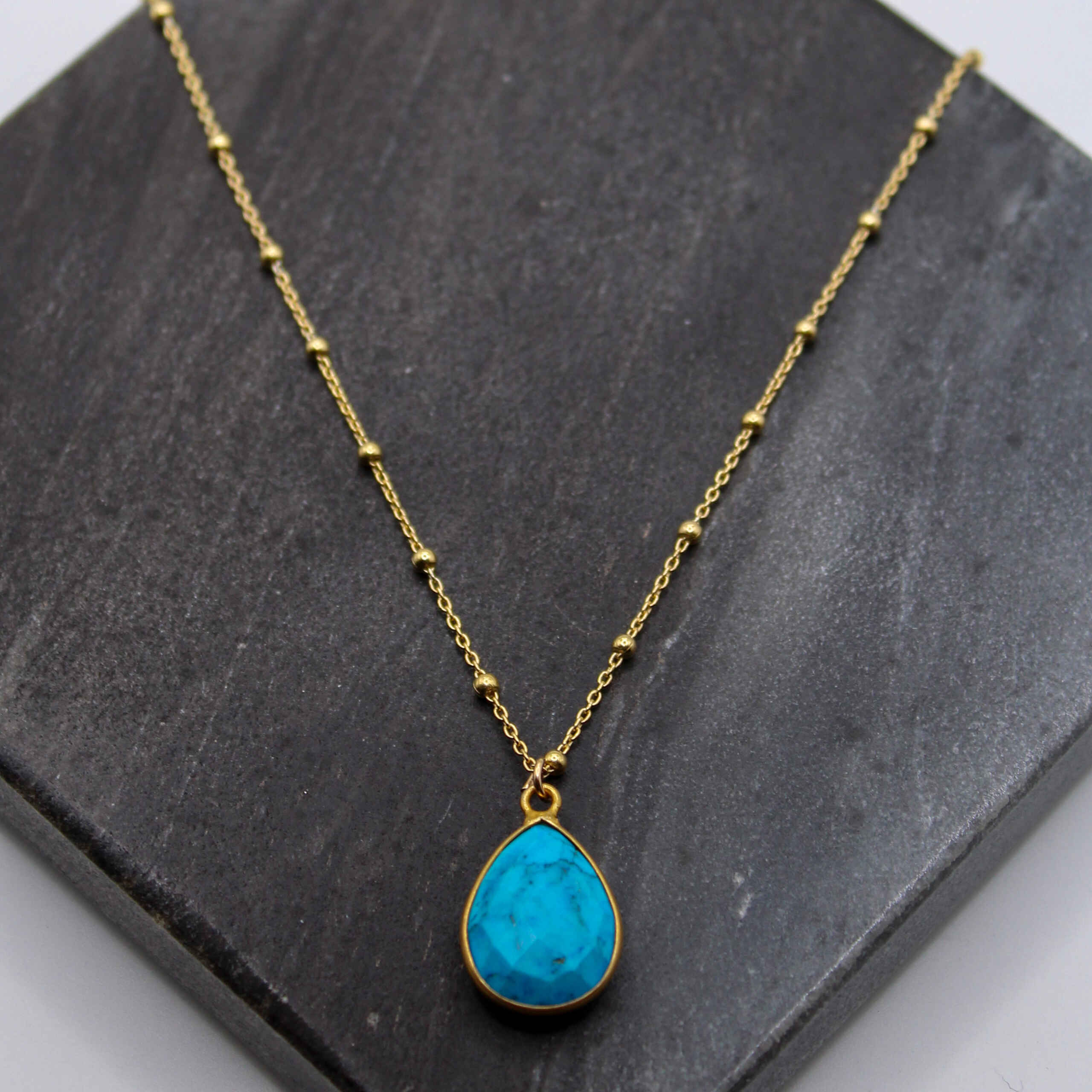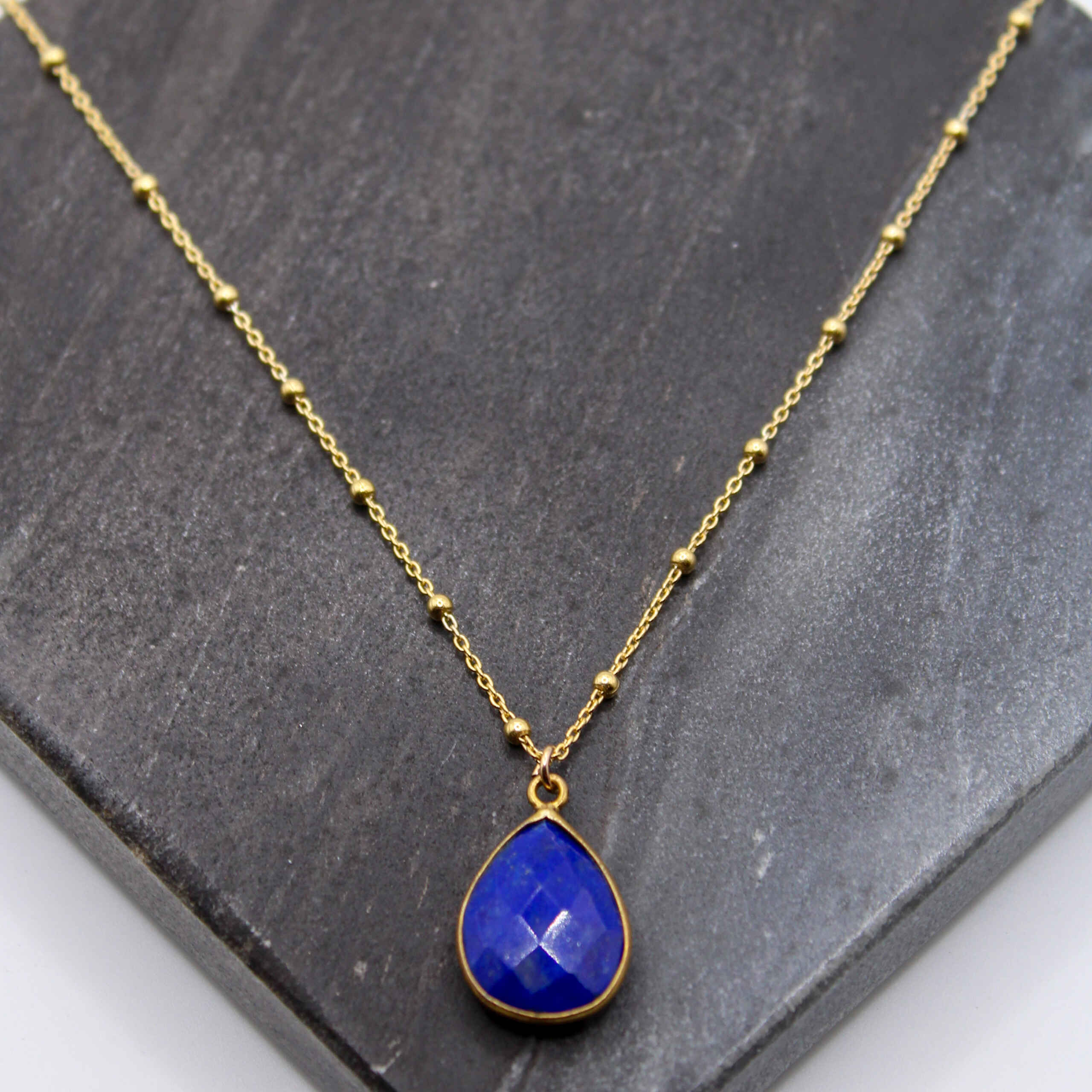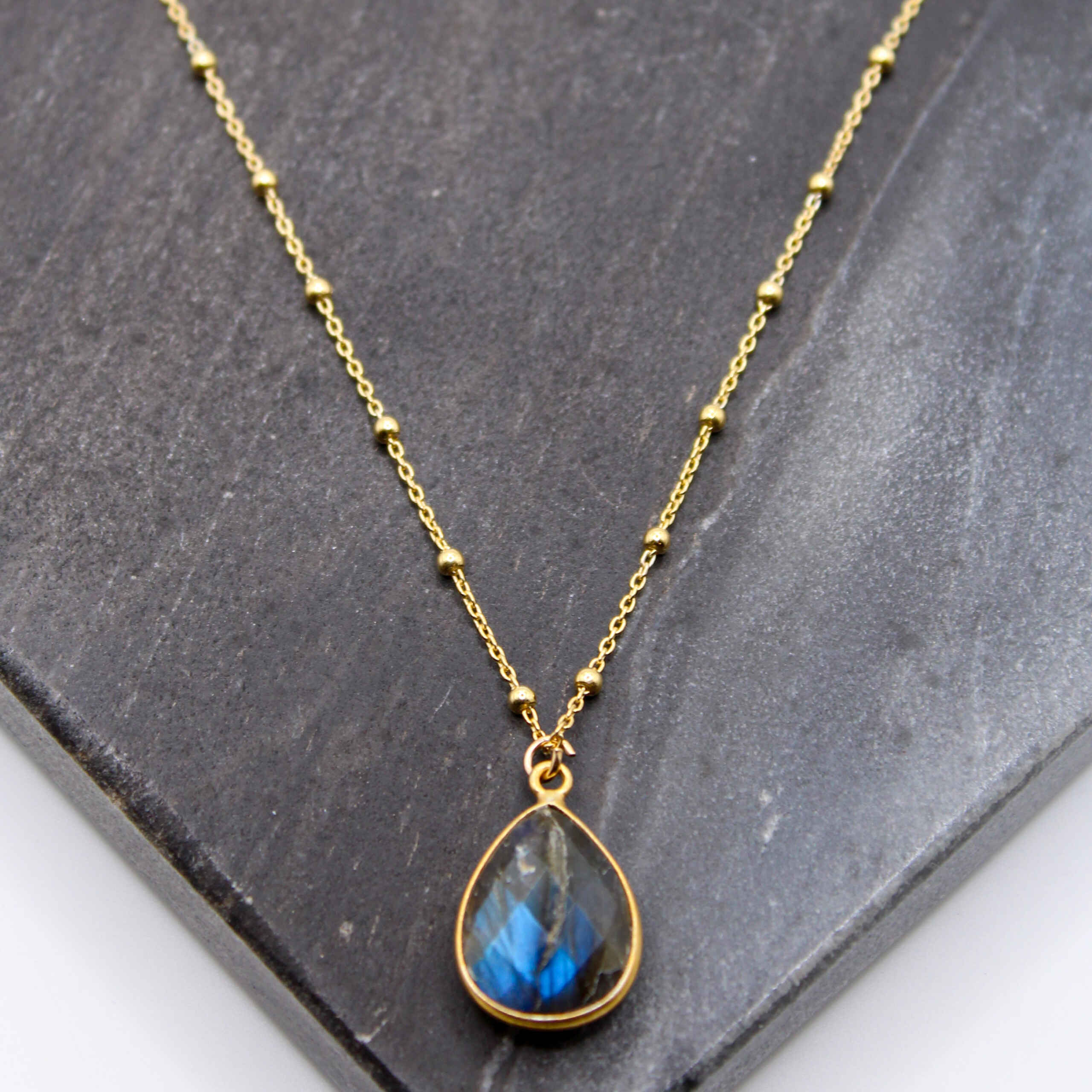 Collier pendentif goutte pierre naturelle, monté sur une chaîne maille boules en plaqué or 3 microns.