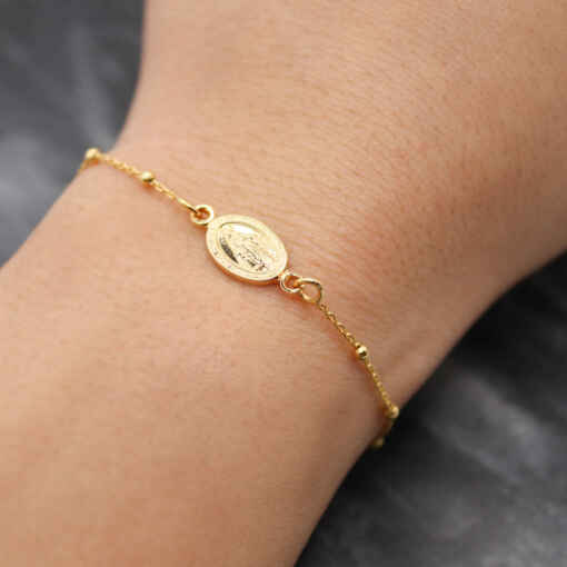 Le cadeau idéal des communions, profession de foi, confirmation… Médaille de la Vierge sur bracelet maille boules en plaqué or.