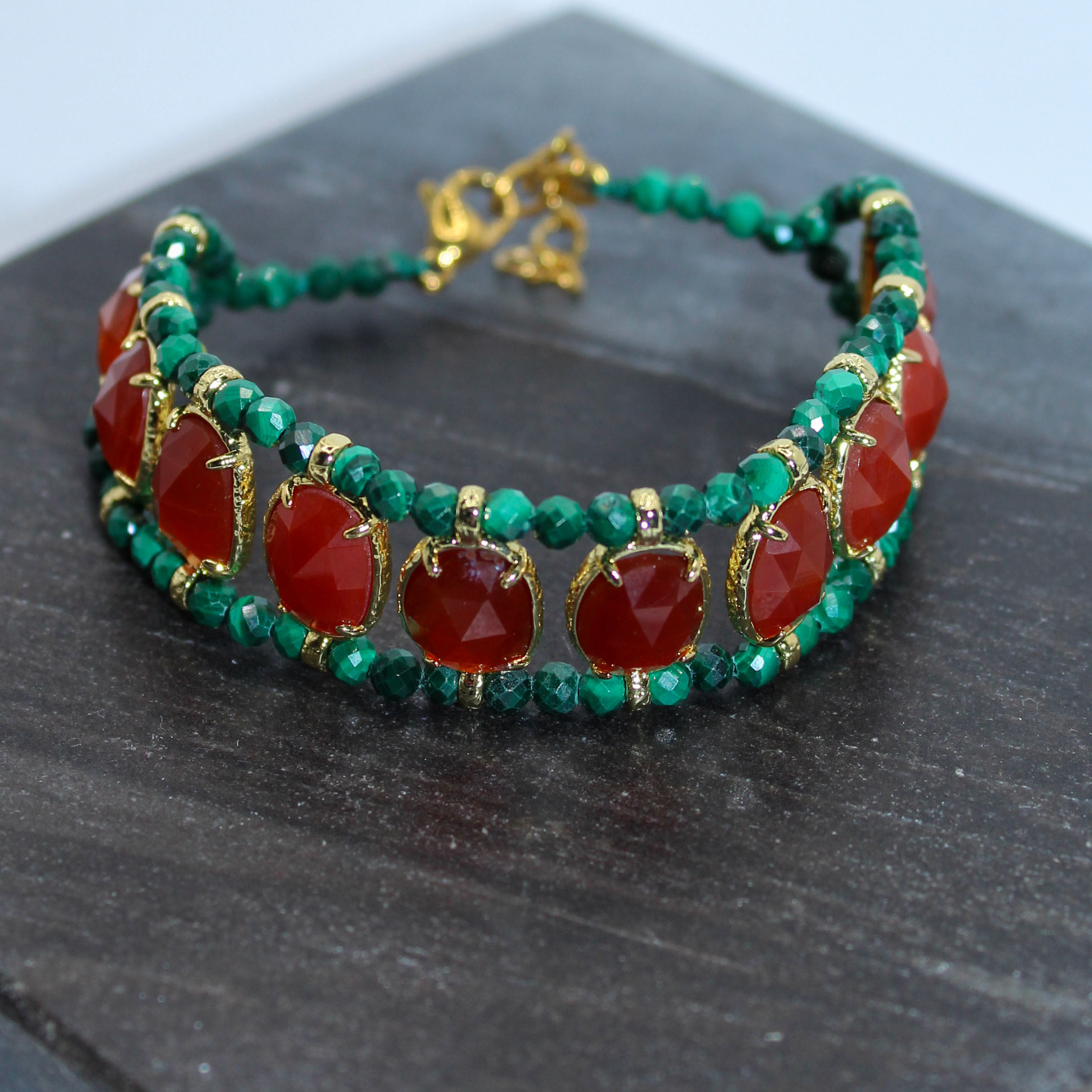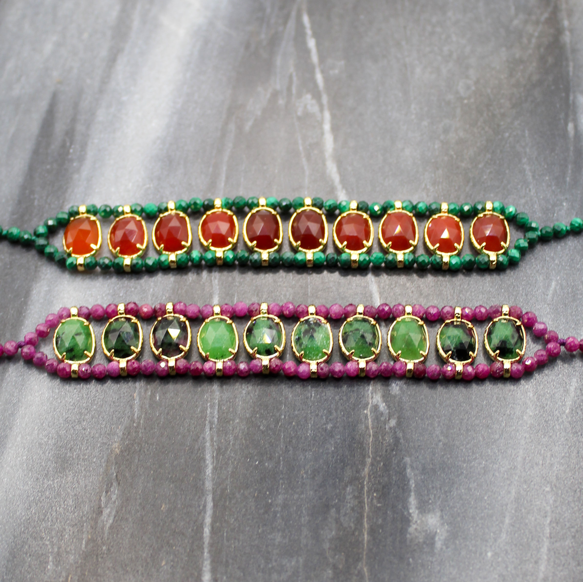 - pierres fines : oeil de tigre, améthyste, turquoise africaine et améthyste, cornaline et malachite