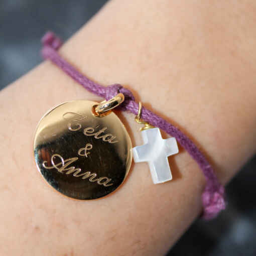 Ravissant bracelet de communion, baptême ou tout autre évènement… composé d’une médaille de 2 cm de diamètre bombée à faire graver