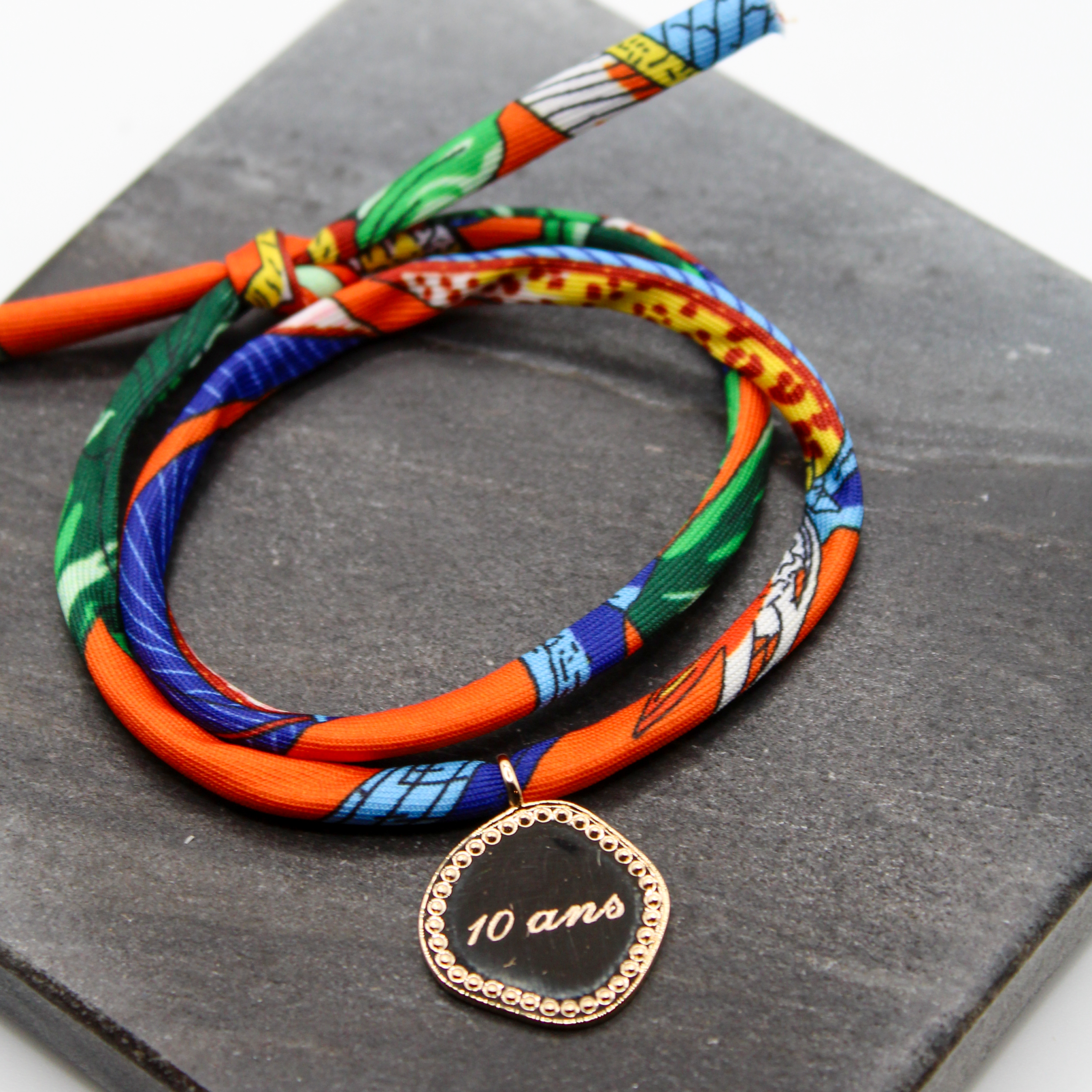 Bracelet Philippe personnalisable avec une médaille irrégulière perlée sur les bord, à graver. La médaille est montée sur un cordon en tissu satiné bleu et orange.