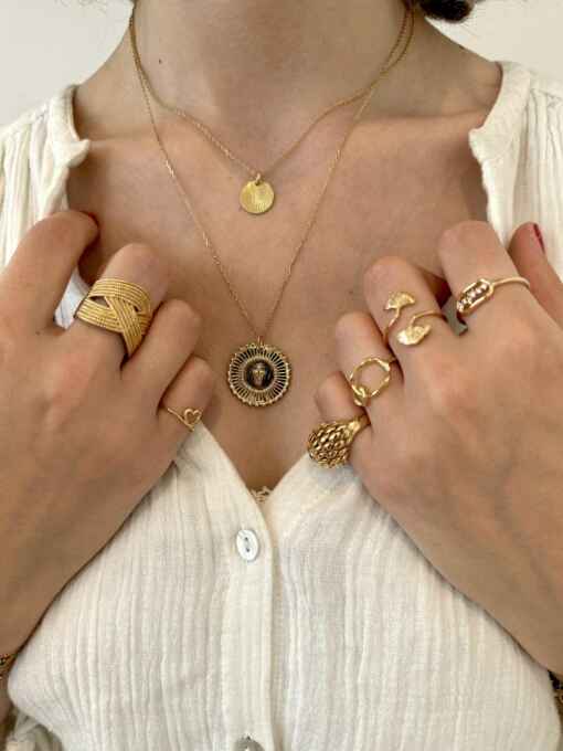 Médaille travaillée en plaqué or  3 microns martelée et délicatement ciselée, très symbolique ( croix), elle est montée sur une chaîne maille boule de 40 cm.