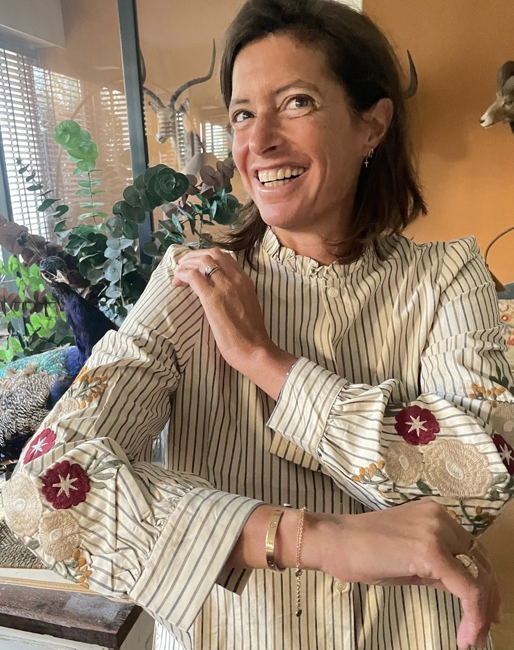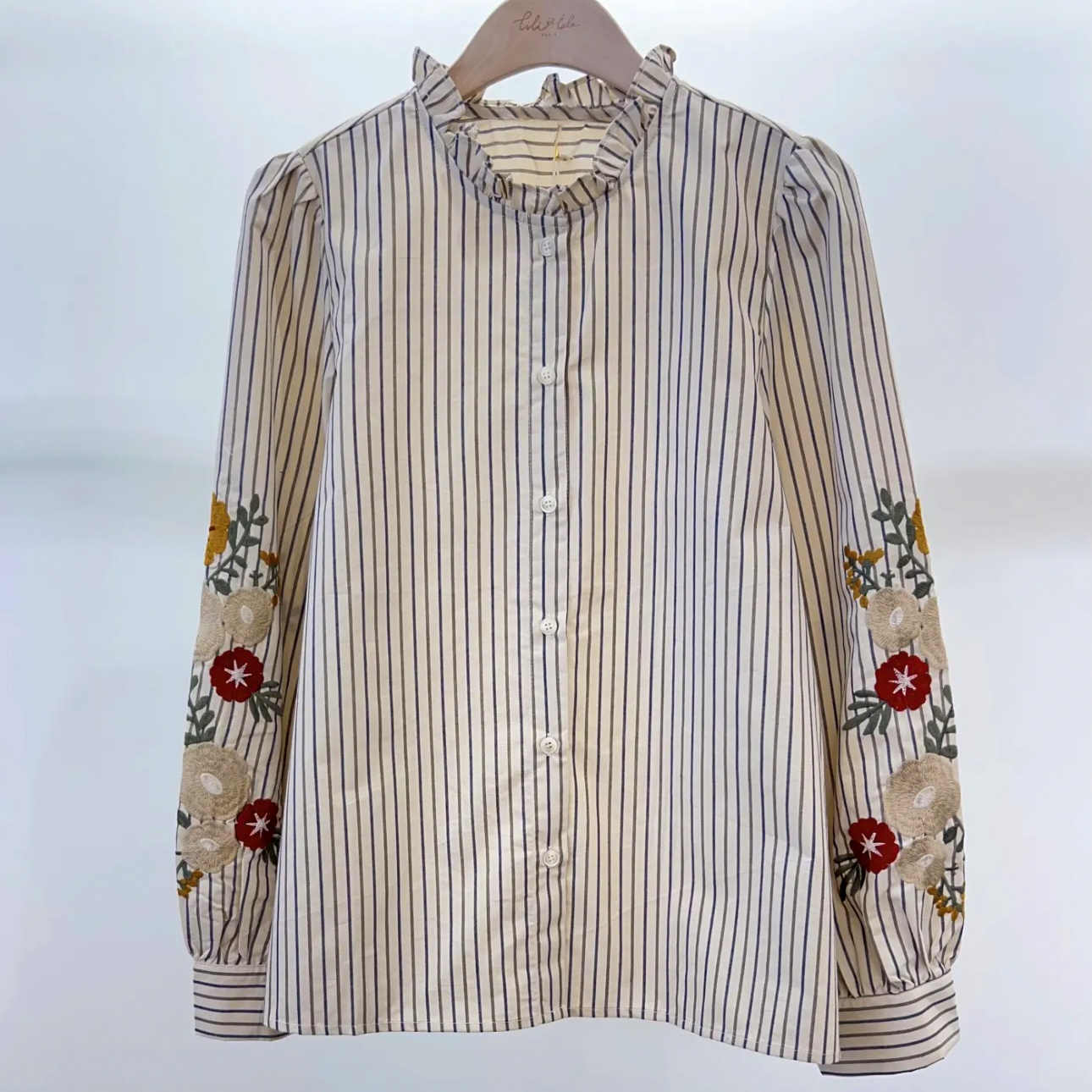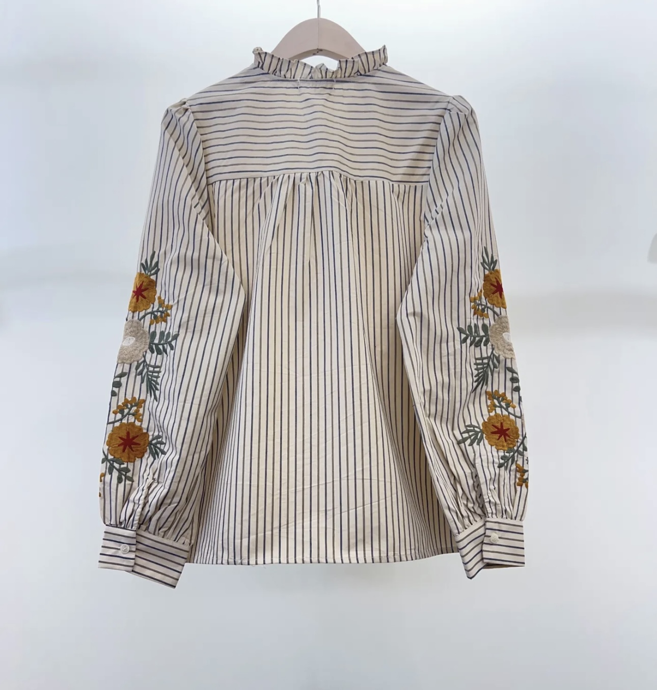 Ravissante chemise en coton rayée avec les manches délicatement brodées, à porter sans modération avec un gilet sans manche par exemple