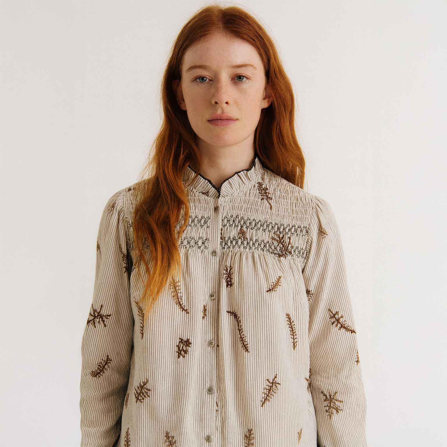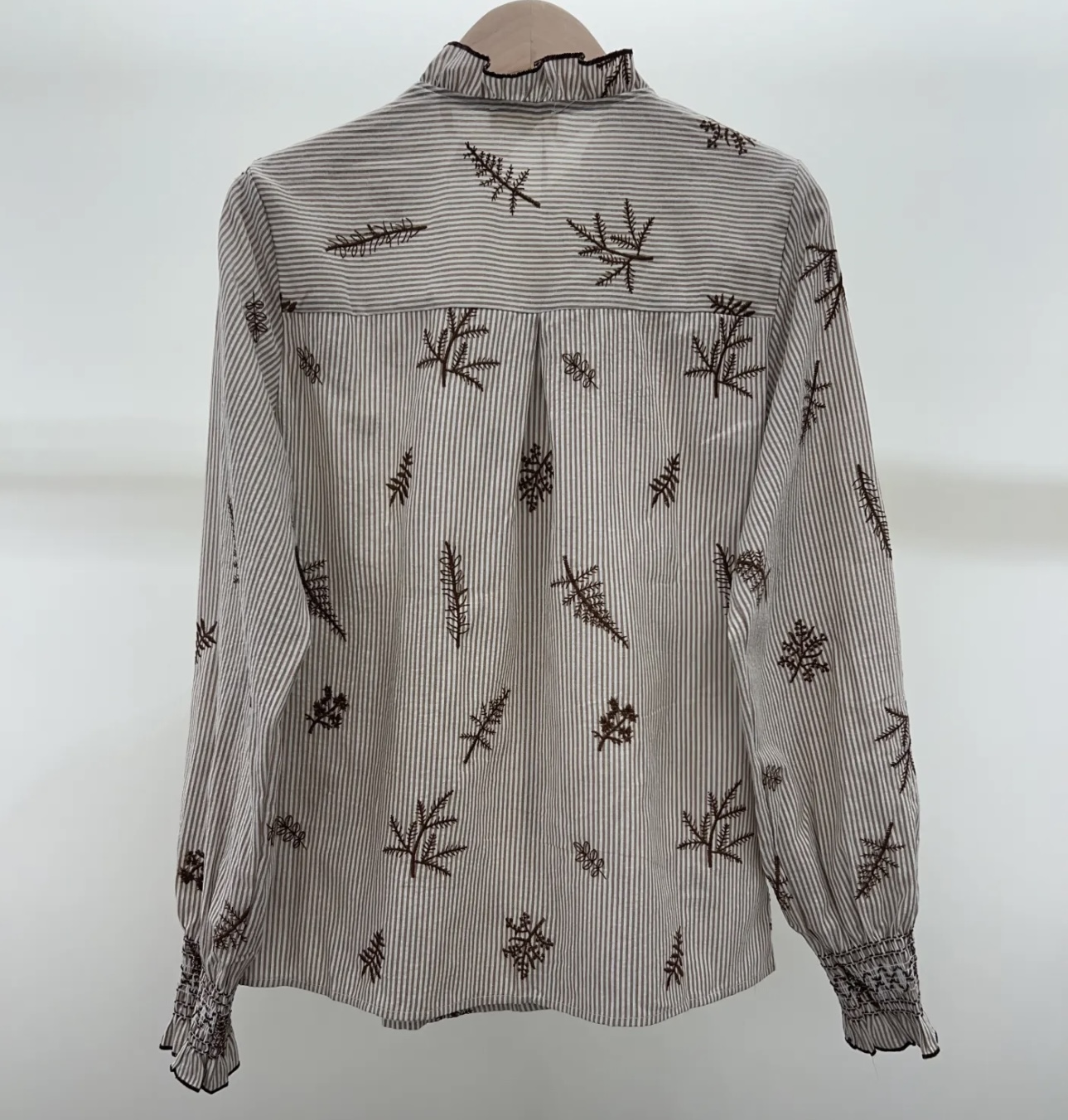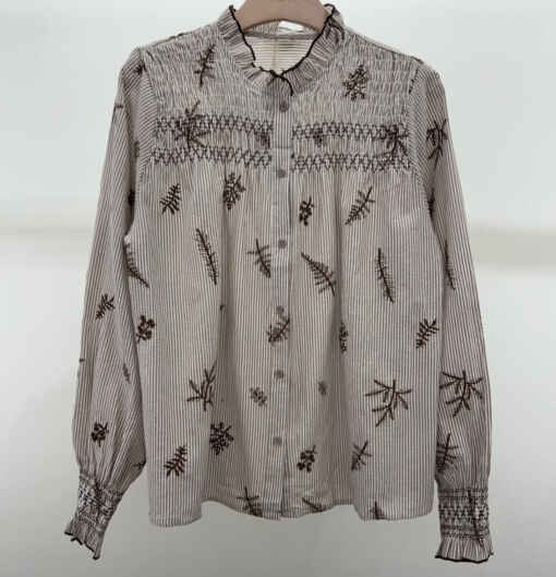 Ravissante chemise en coton, rayée et brodée, avec des fronces sur le col et le bout des manches, à porter sans modération avec un gilet sans manche par exemple