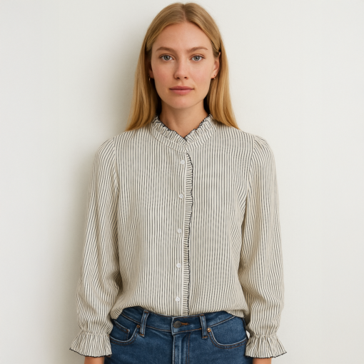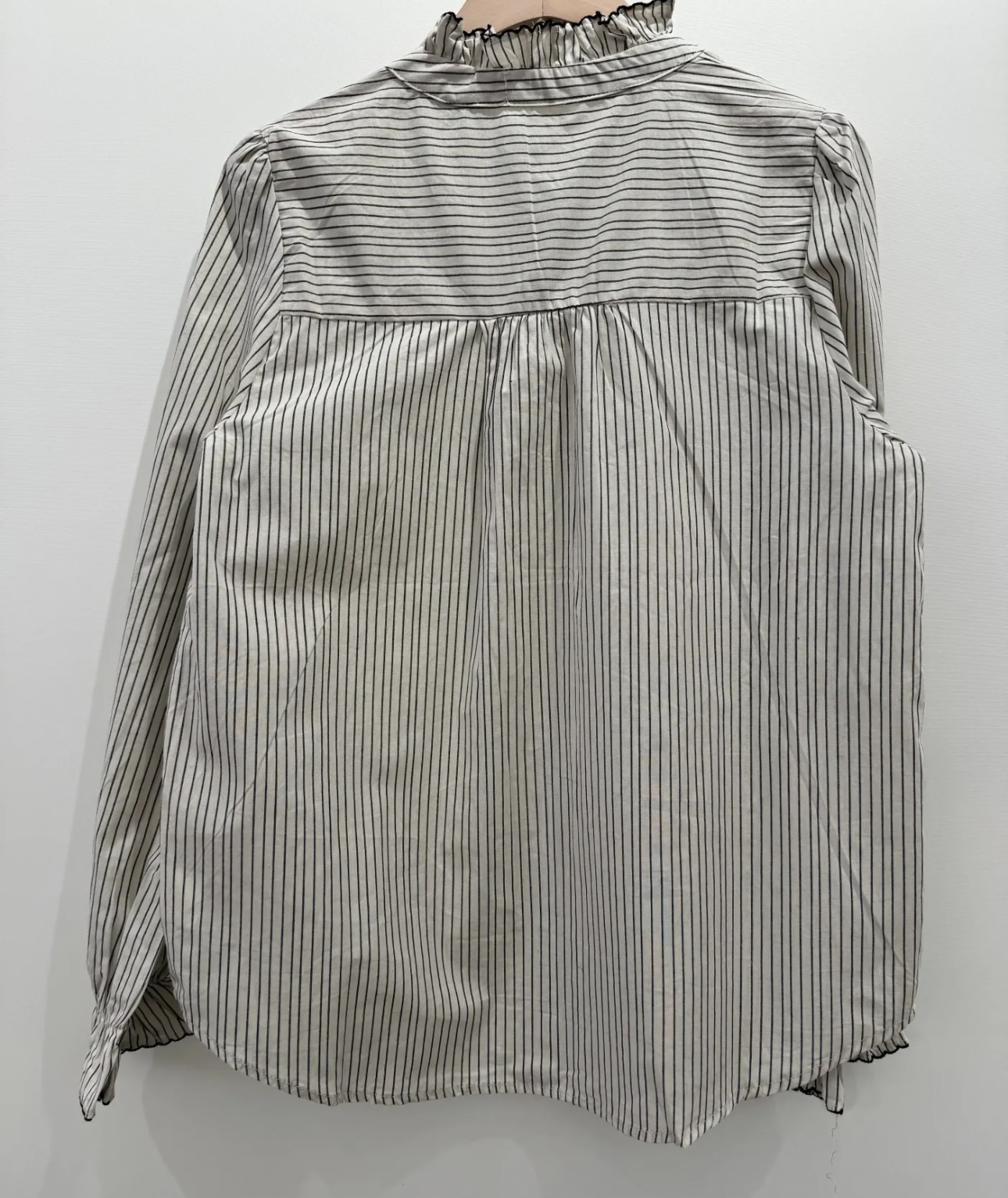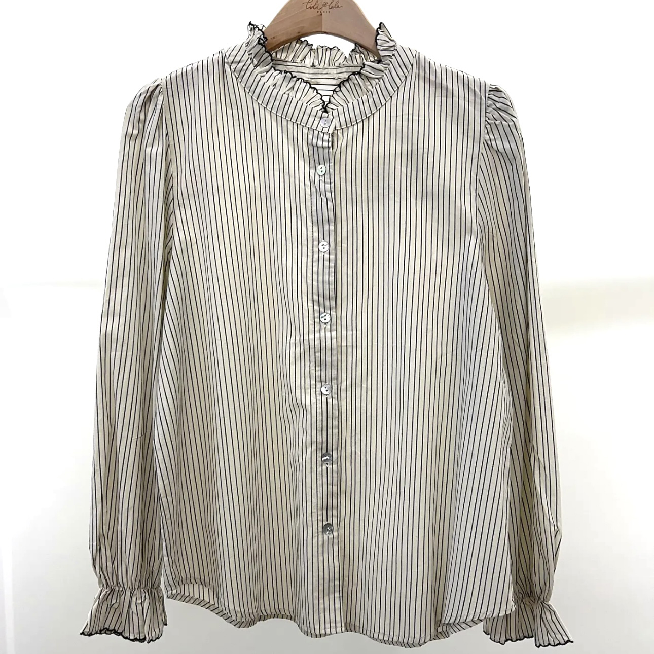 Ravissante chemise en coton, rayée avec le col et le bout des manches brodés de noir, à porter sans modération avec un gilet sans manche par exemple