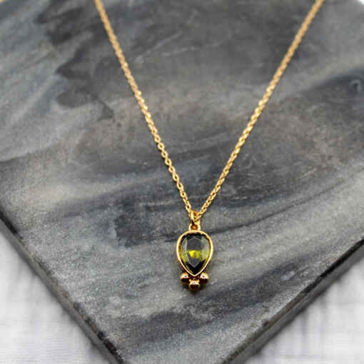 Collier en plaqué or, surmonté d’un pendentif goutte serti d’un zirconium teinté violet ou vert olive.