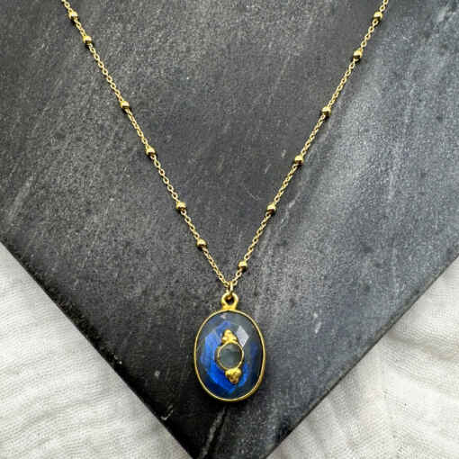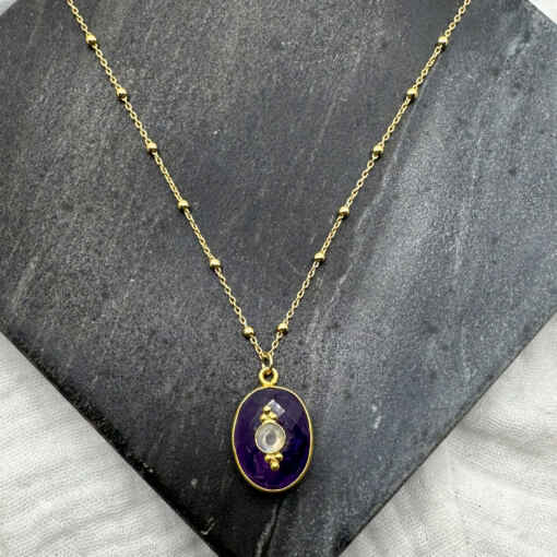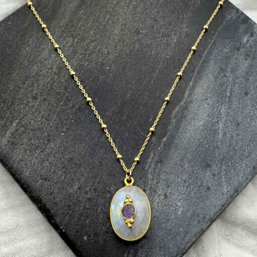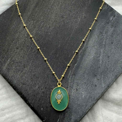 Ravissant collier en plaqué or et pierre fine ovale surmontée d’un grigri.