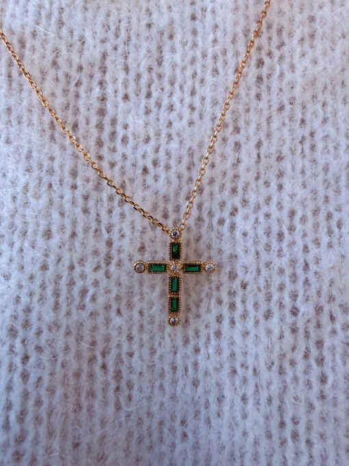 Collier Ethan avec une croix ornée de zirconiums blancs et vert et montée sur une chaine maille forçat de 40 cm en plaqué or 3 microns.