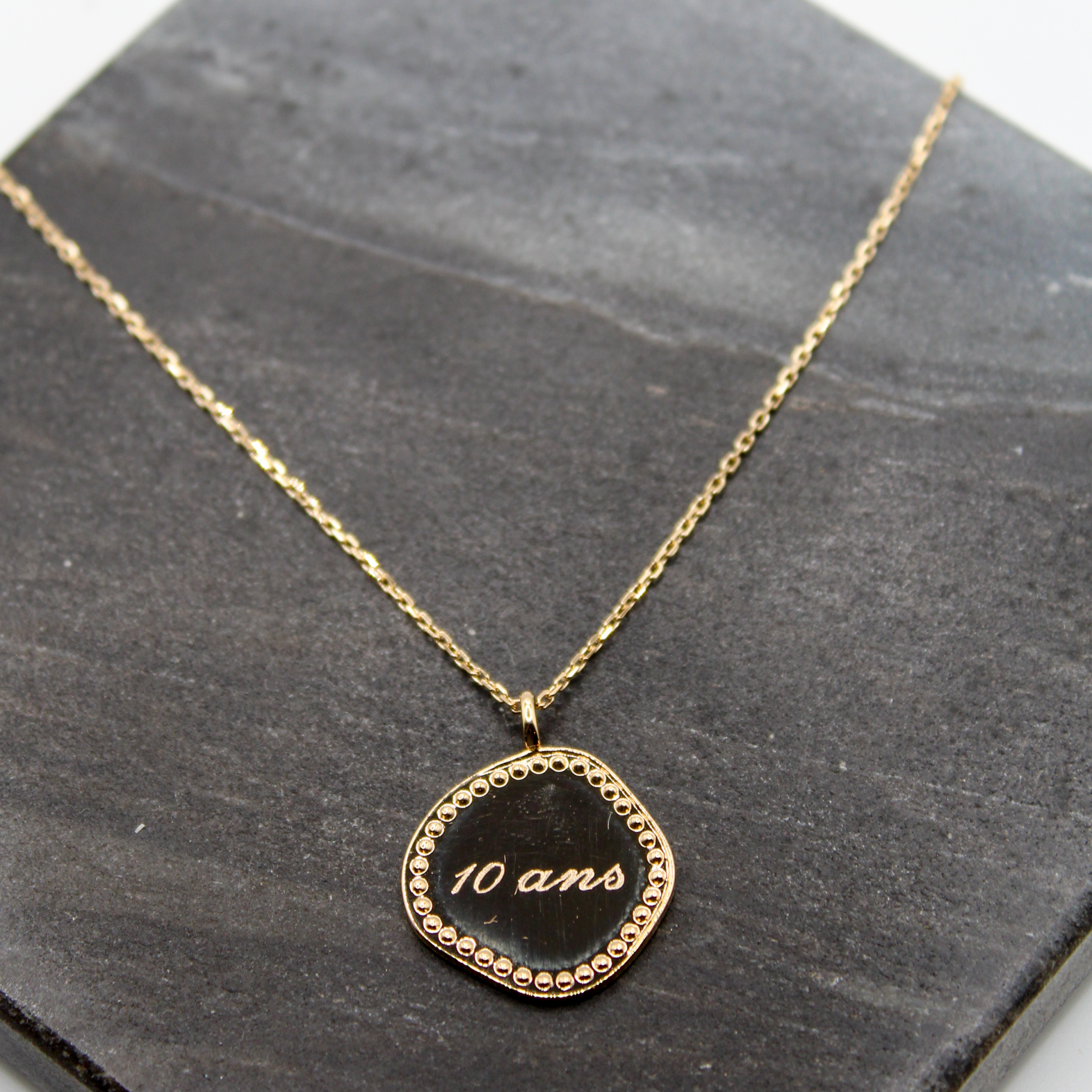 Collier Philippine personnalisable avec une médaille irrégulière perlée à graver et montée sur une chaine maille forçat de 40 cm.