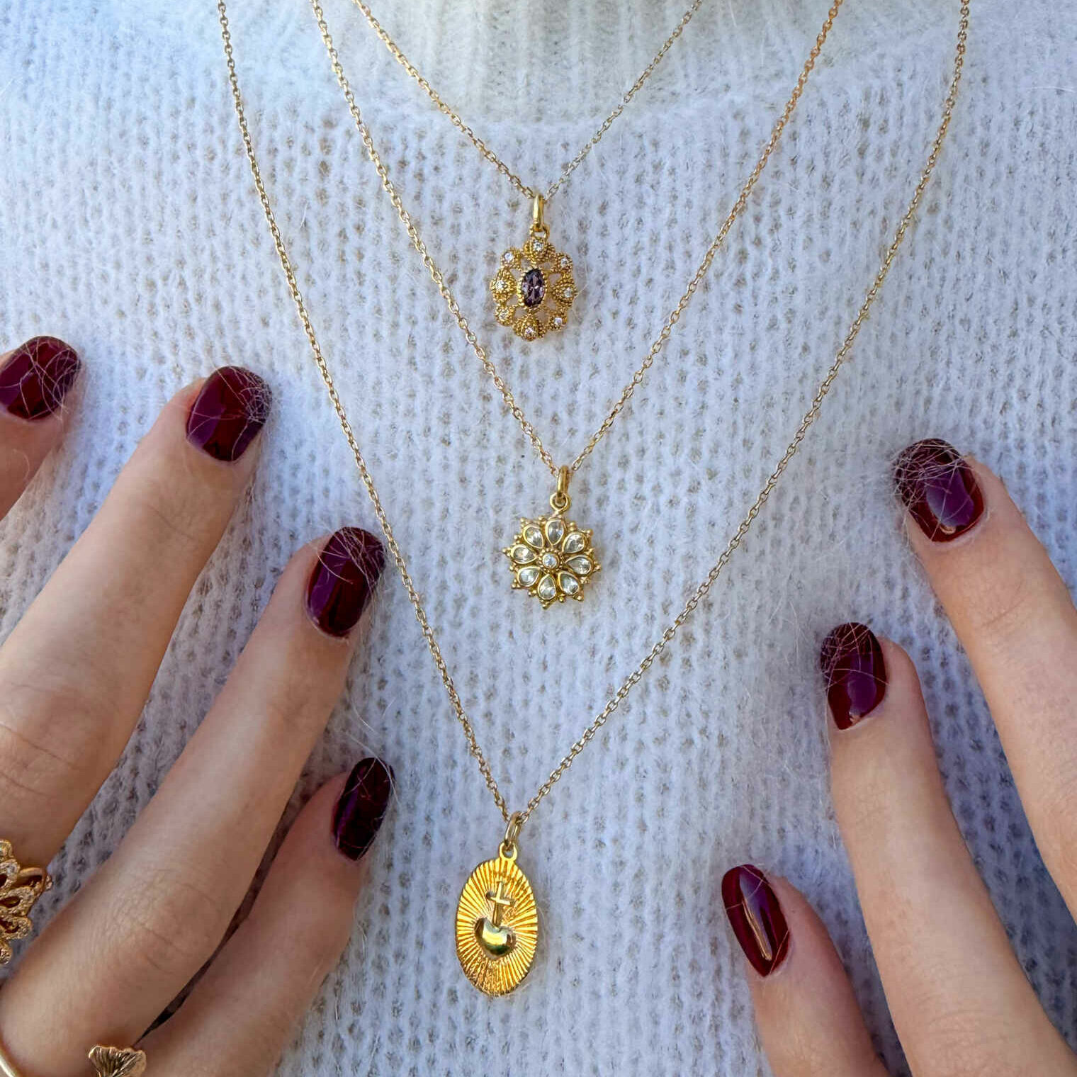 Collier Clémence sur chaine en plaqué or 3 microns avec pendentif inspiré des années 30 et surmonté d’une amethyste et de plusieurs zirconiums blancs.
