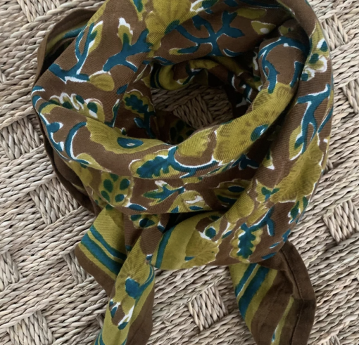 Foulard kaki en coton tout doux imprimé Block-print, très souple.