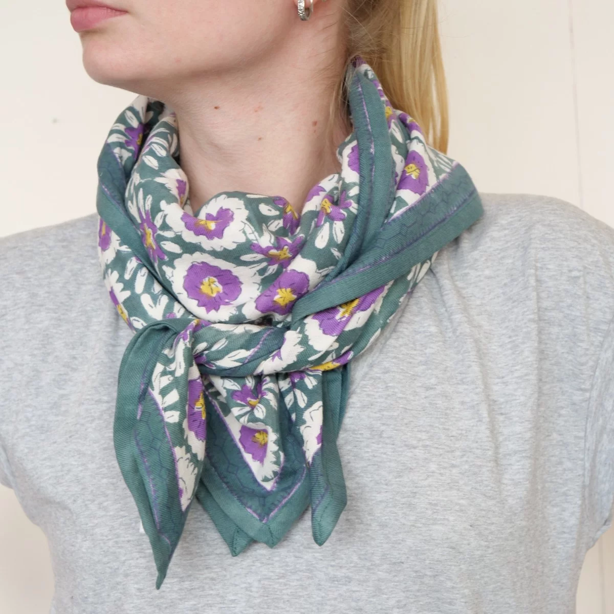 foulard Margotte Vert Sapin en coton imprimé à la main en Inde, très souple et doux.
