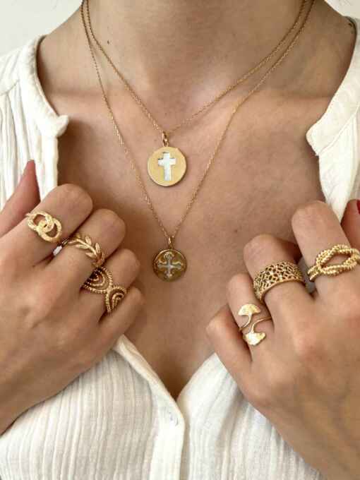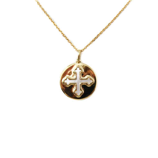 Le collier Gabrielle consiste en un ravissant médaillon en plaqué or 3 microns, surmonté d’une croix en nacre blanche.