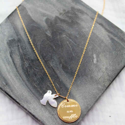 Médaille plaquée or 3 microns perlée sur les bords  ornée d’une colombe en nacre et montée sur une chaîne en plaqué or