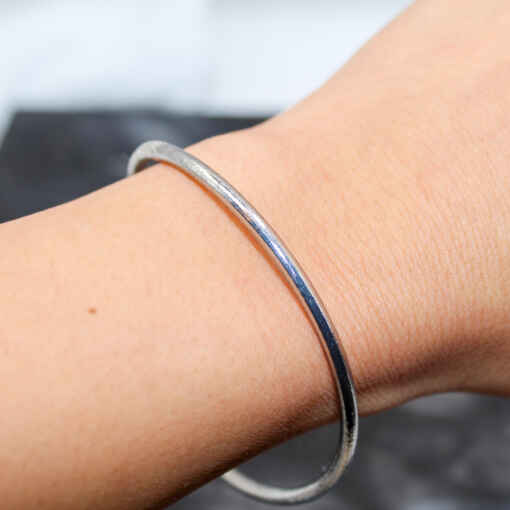 Jonc argenté fin, très léger et qui ne fait pas de bruit. À accumuler sans modération.