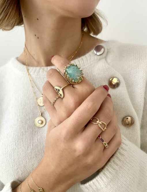 Si vous recherchez un look plus travaillé, n’hésitez pas à superposer cette bague avec d’autres, telles nos bagues Clarence, Chachou ou Madeleine.