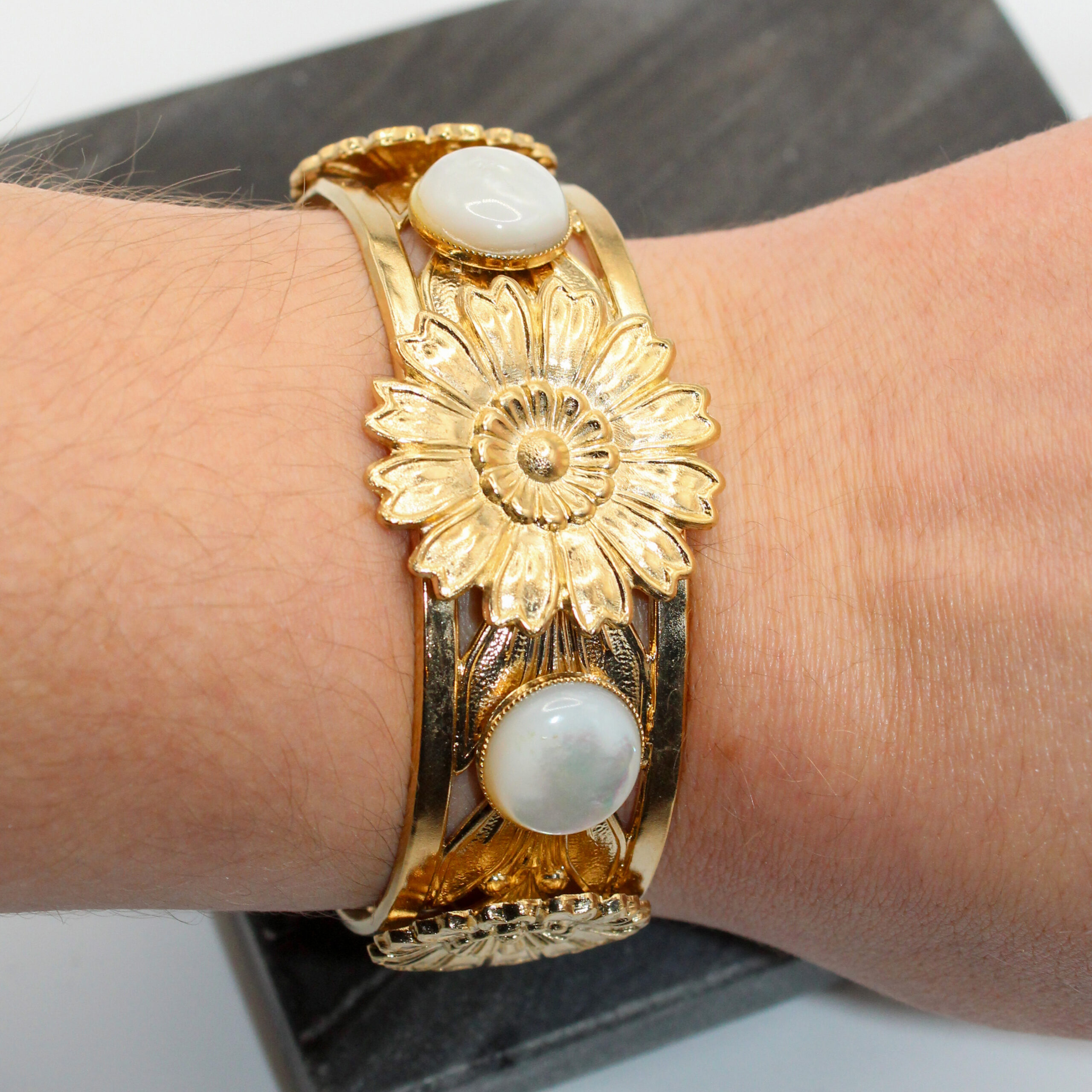 Manchette Ludivine ornée d’une fleur en son centre, doré à l’or fin et surmontée de pierres fines (nacre).