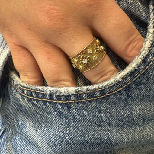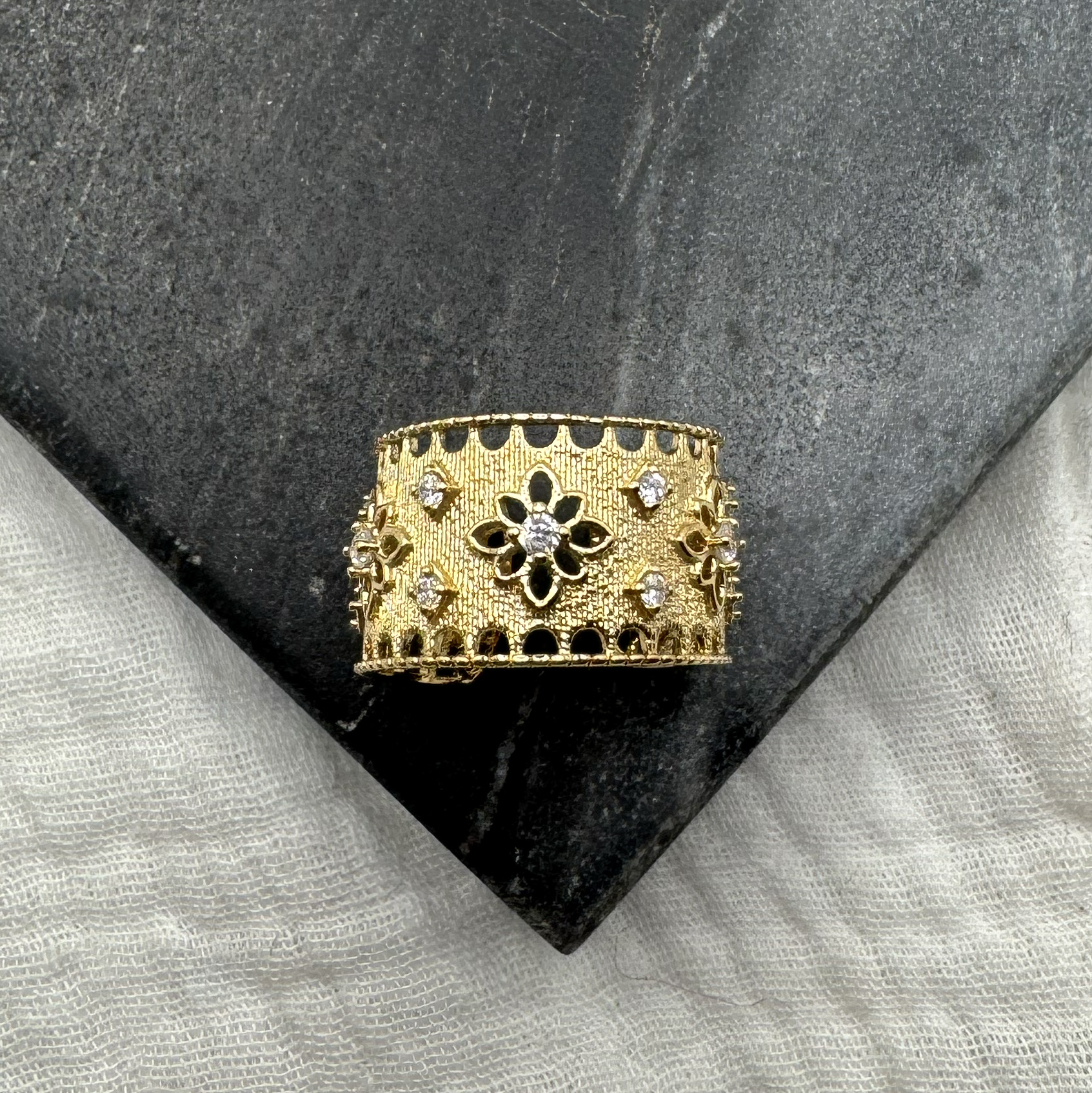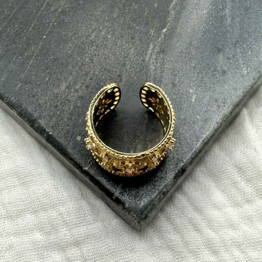 Bague ajourée, en plaqué or mat 3 microns, sertie de petits zirconiums.