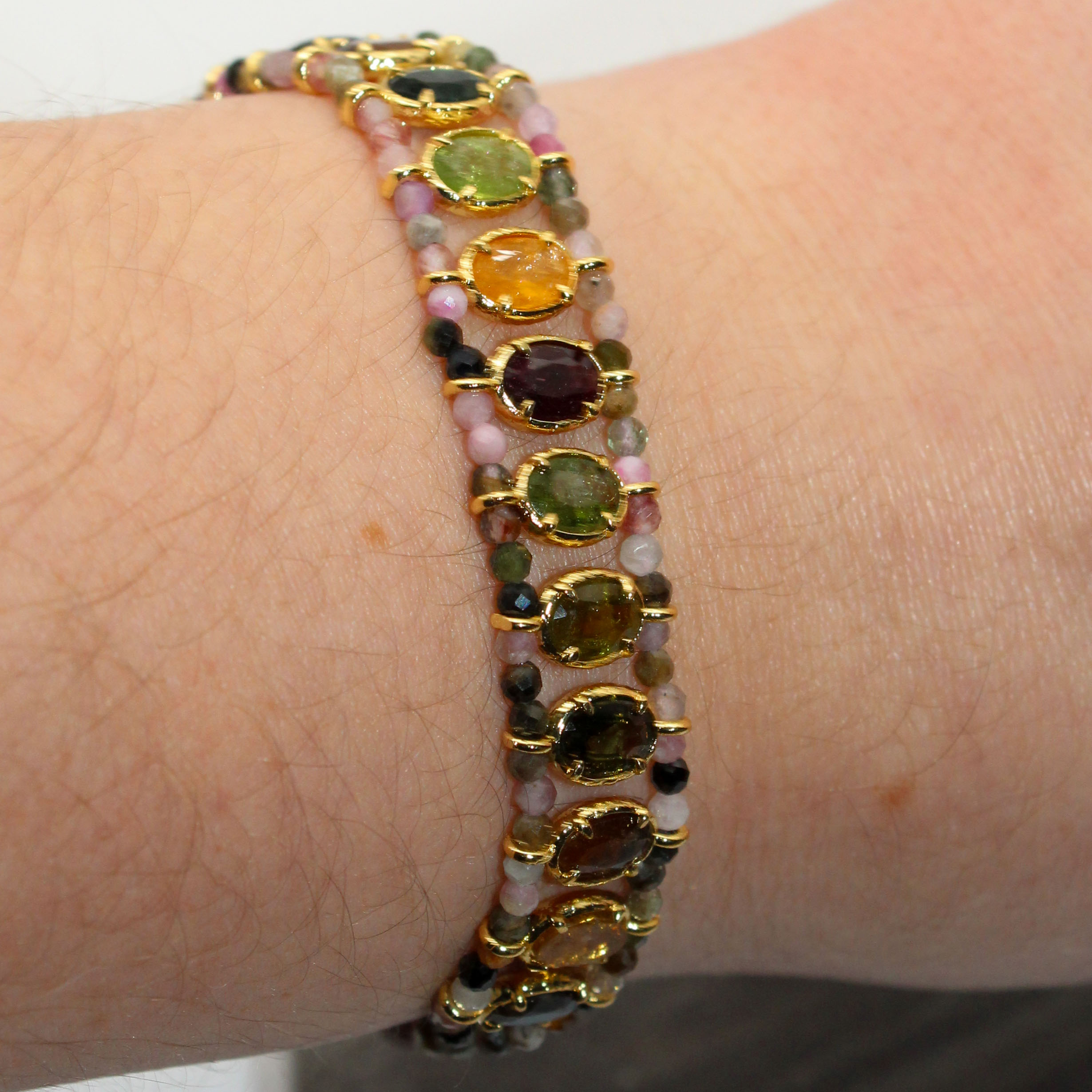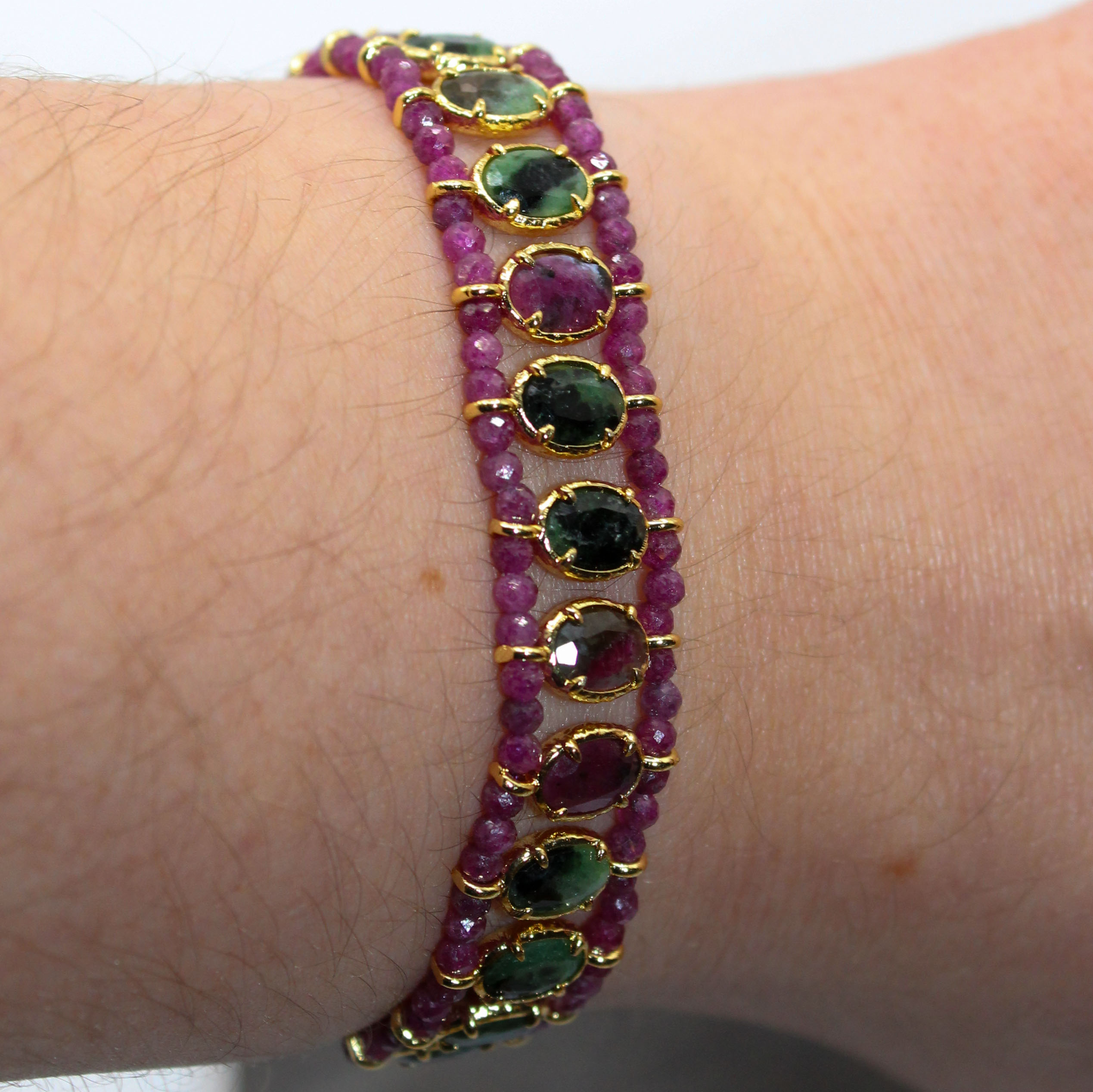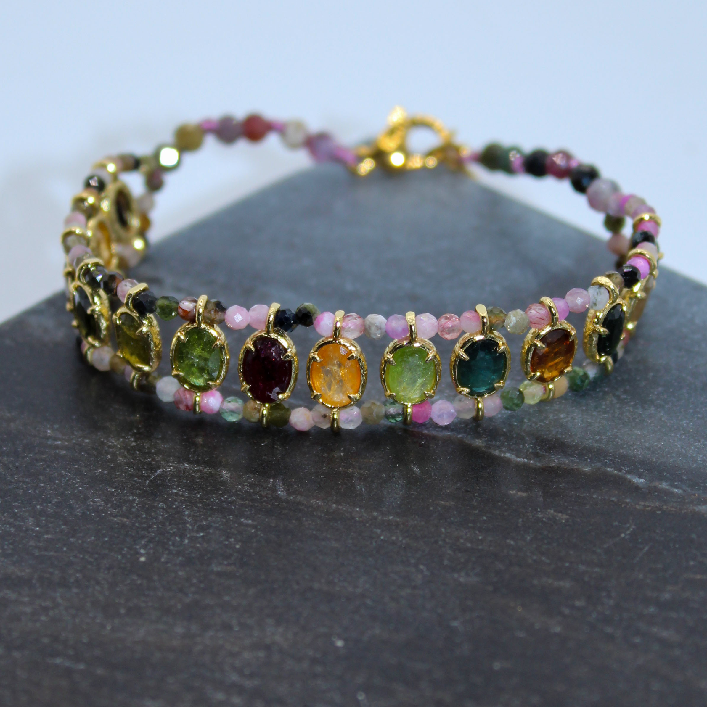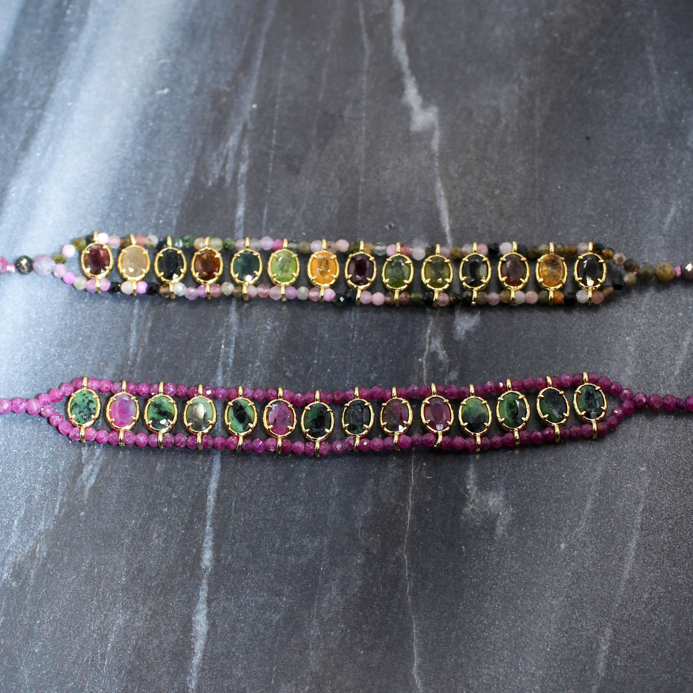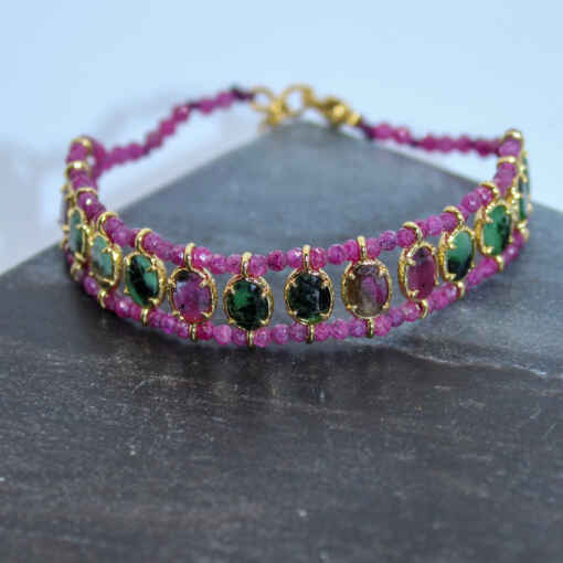 Bracelet Raphaël composé de pierres fines ovales et tissées entre des perles.