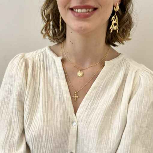 Collier en plaqué or et croix dorée ornée de petits détails qui la rendent unique.