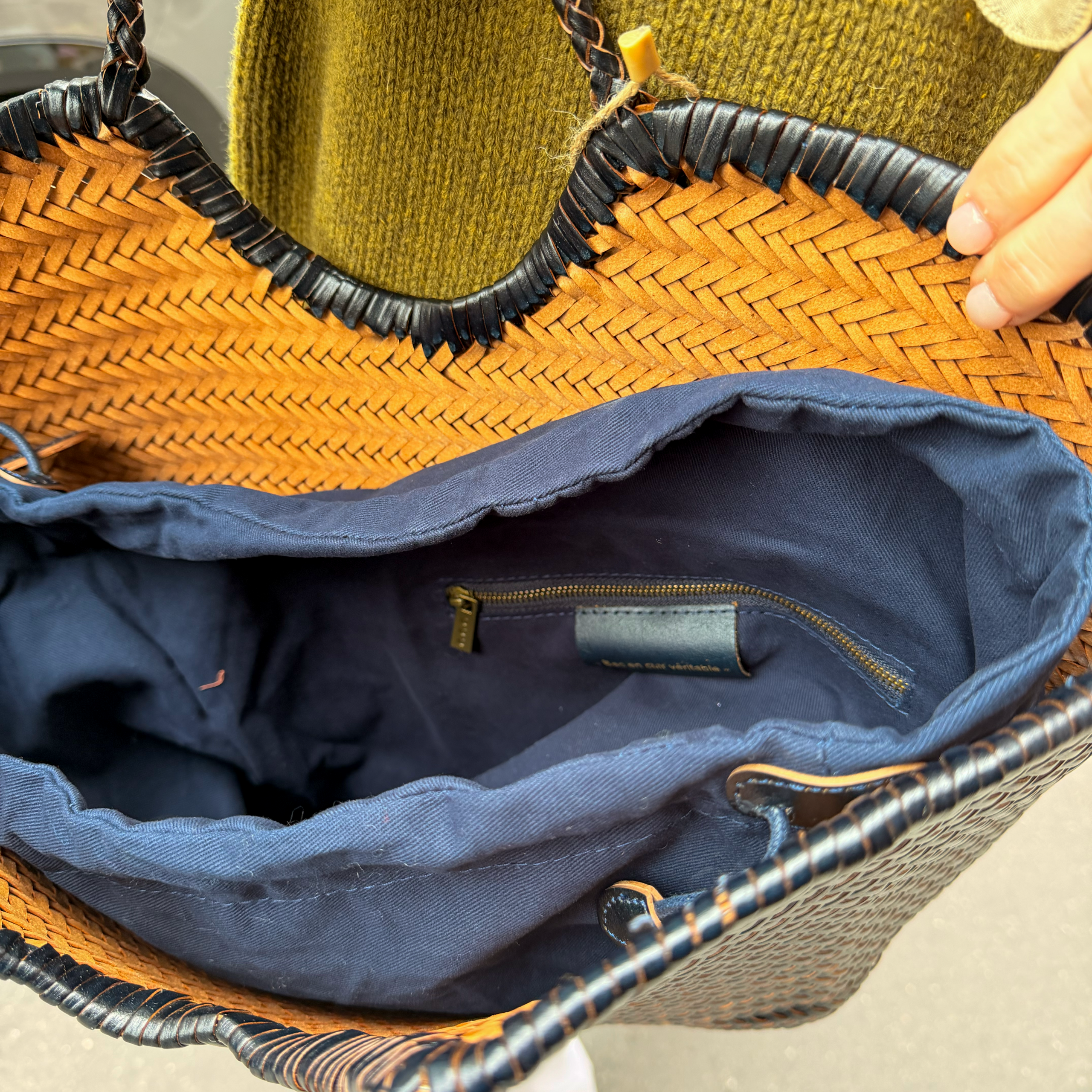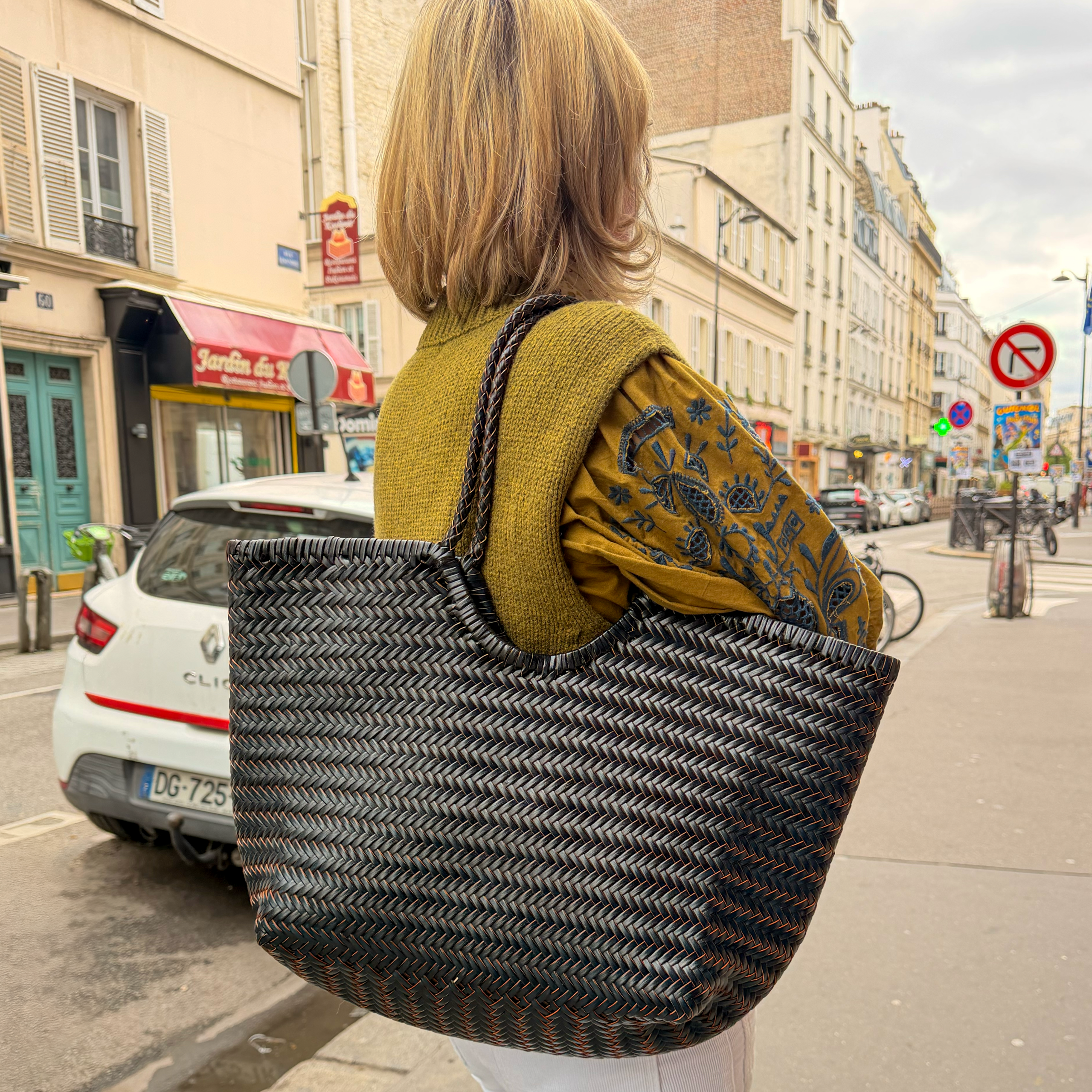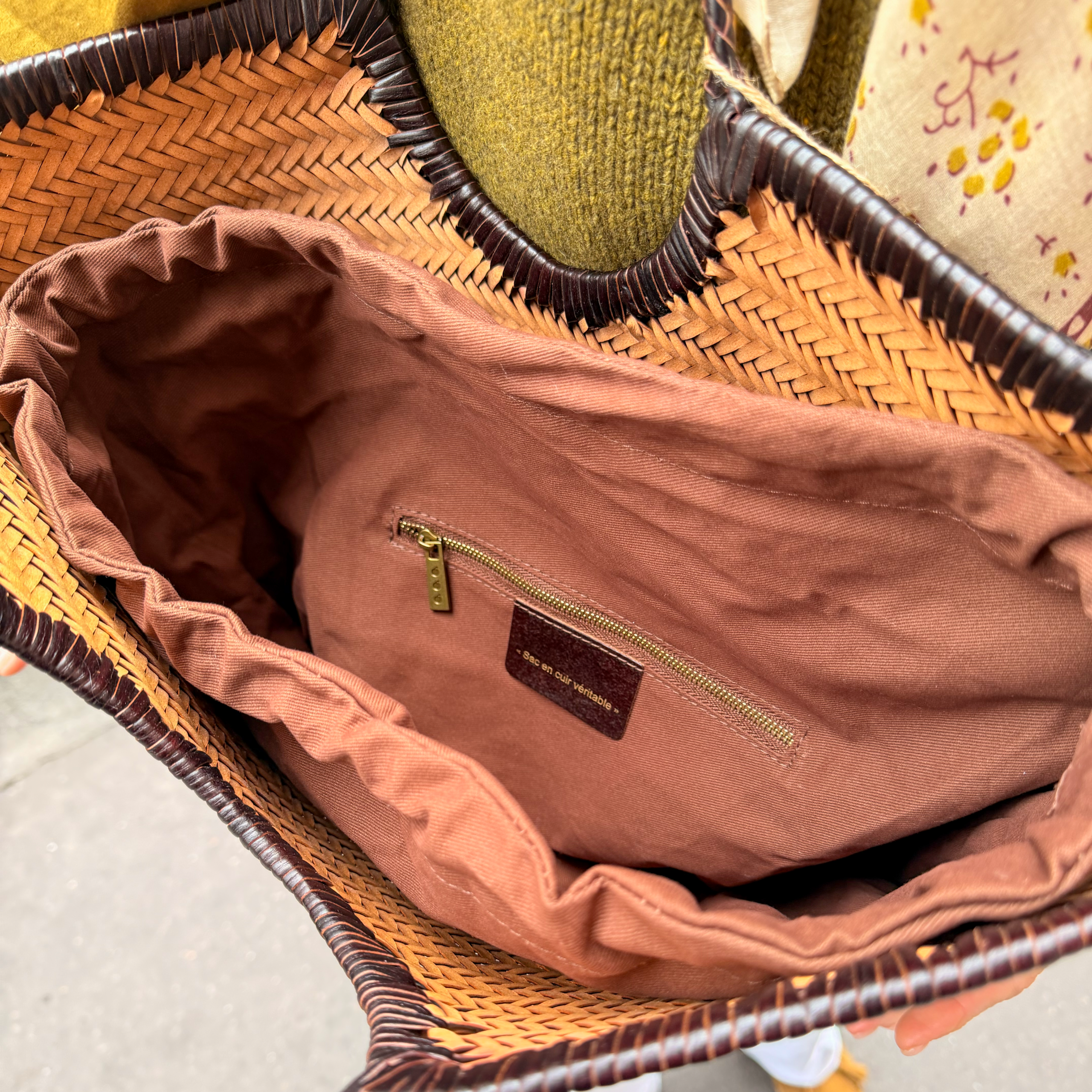 Sac cabas en cuir véritable avec un tressage minutieux, il est doté d’une poche intérieure en coton et fermable à l’aide d’un cordon.