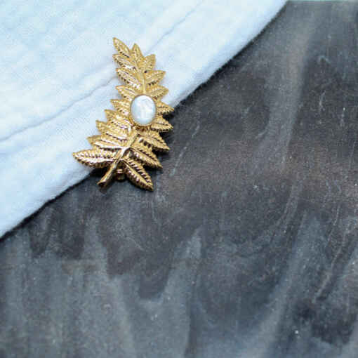 Ravissante broche en plaqué or satiné ornée d’une pierre ovale, à porter sans modération sur une veste, un manteau ou un chemisier
