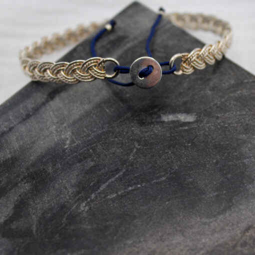 Ravissant jonc tressé en argent massif, plaqué or , il est fermé par un bouton de la même matière et un cordon de couleur