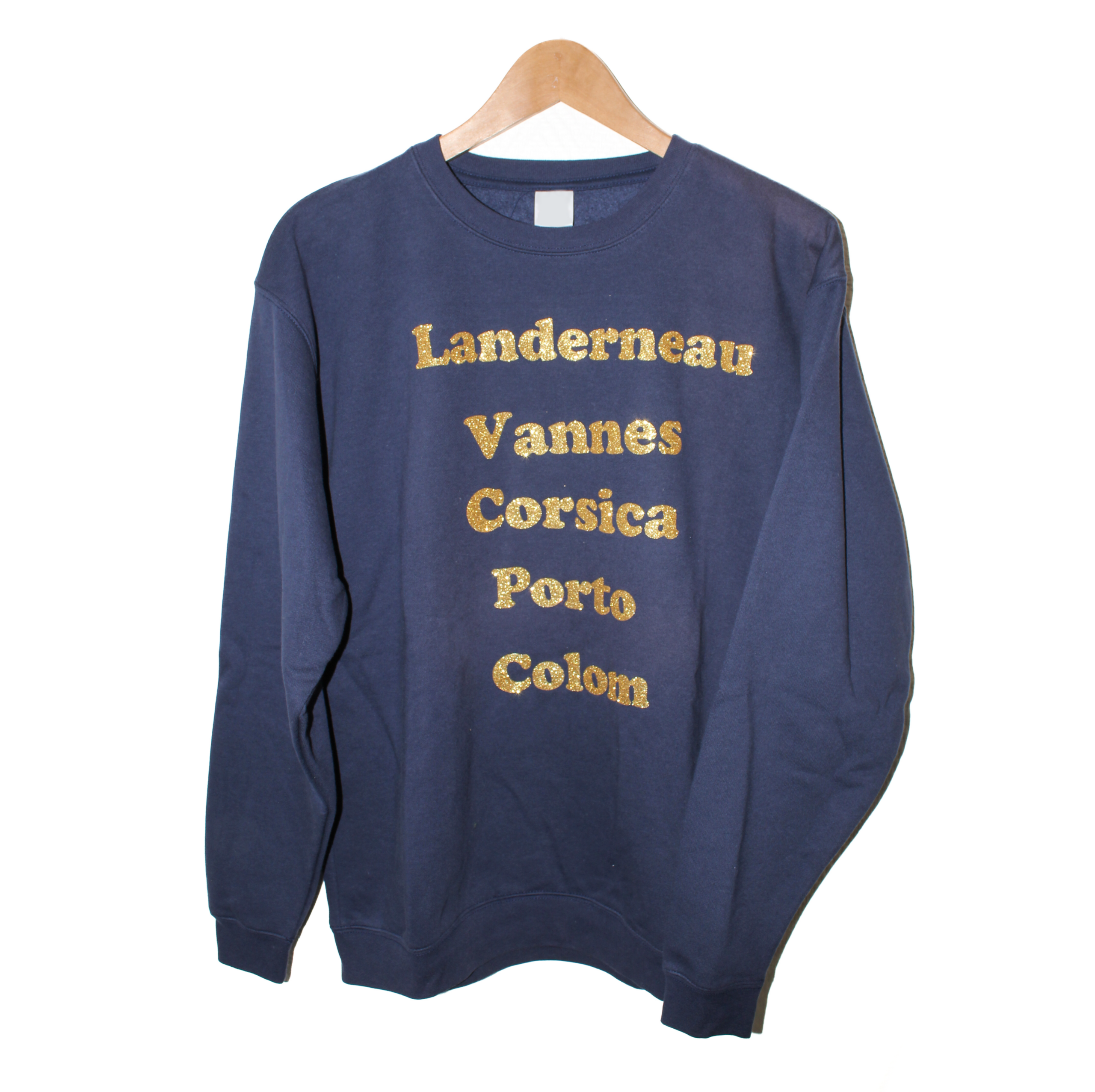 Sweat bleu flocké en paillettes or, villes Landerneau, Vannes, Corsica, Porto et Colon