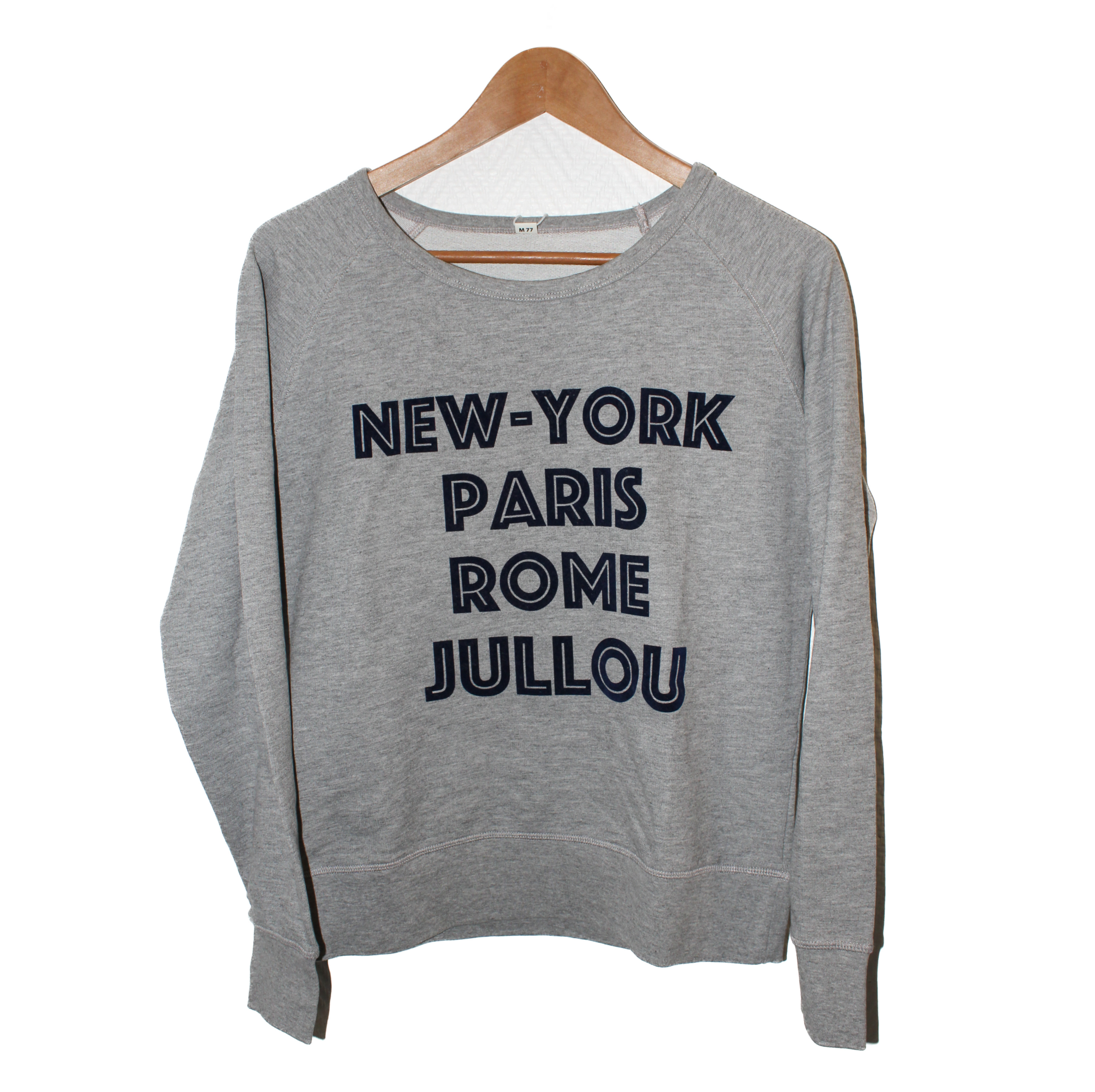 Sweat gris flocké velour marine, villes New-York, Paris, Rome et Jullou