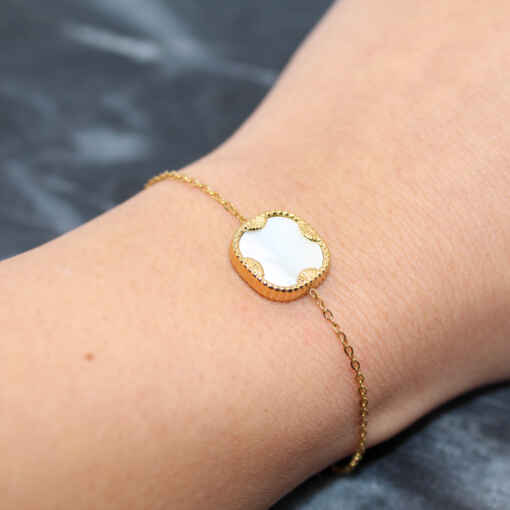 La chaîne sur laquelle est monté le bracelet est en plaqué or 3 microns, ce qui garantit sa couleur et son éclat au fil des années.