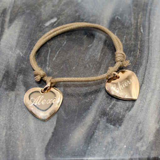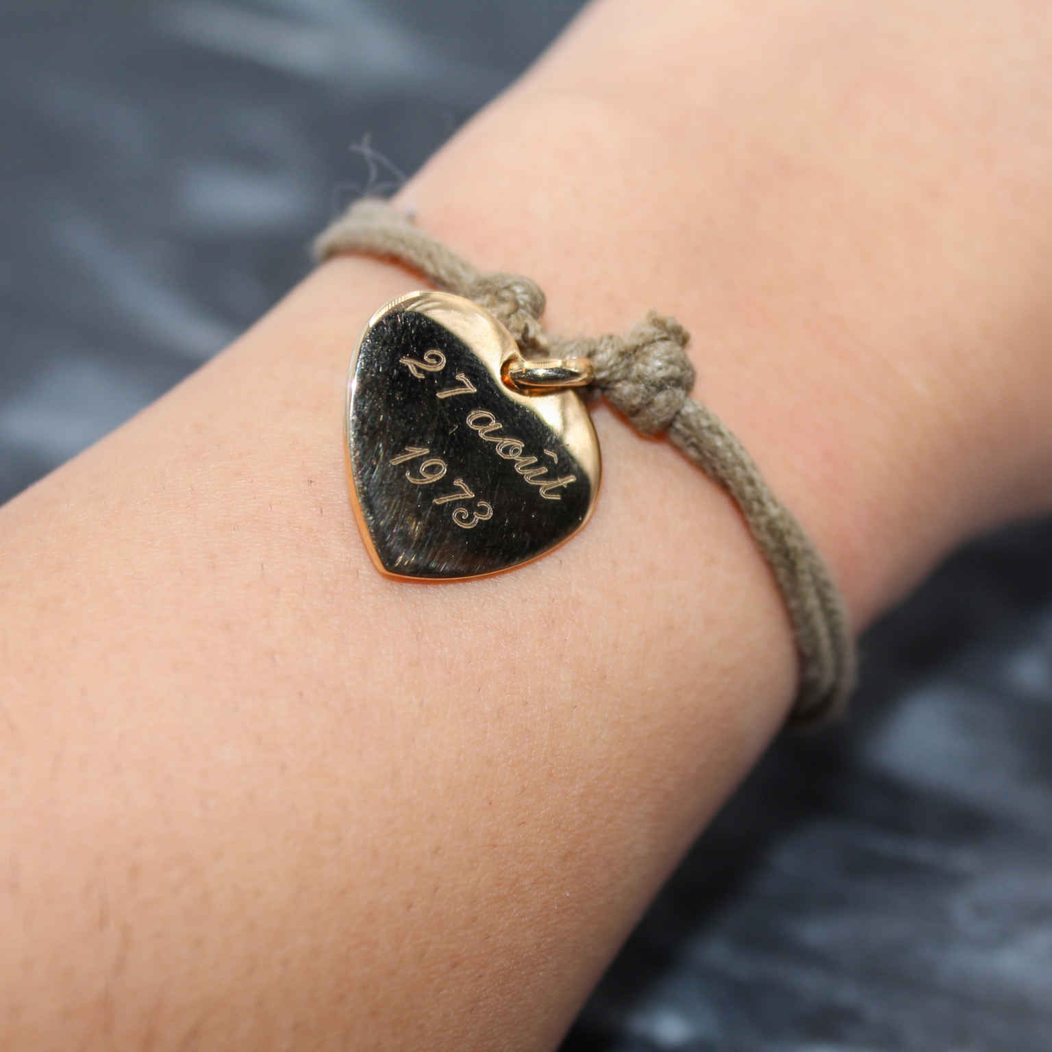 Médailles en forme de coeur, plaquées or 3 microns ou argent massif montées sur un bracelet du coloris de votre choix.